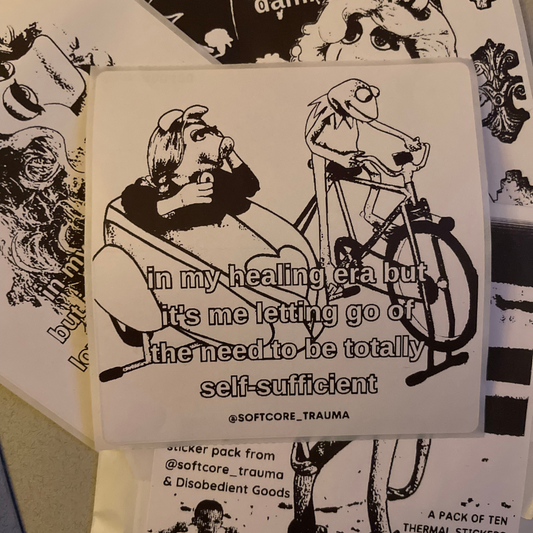 Part of the original vision here at Disobedient Goods is to collaborate with friends & close community. We believe collaboration is a love language; we believe friendship is revolutionary. Put the two together & some real magic can happen. In our case, stickers – our design, curation & production labor, their words, wisdom & presence.