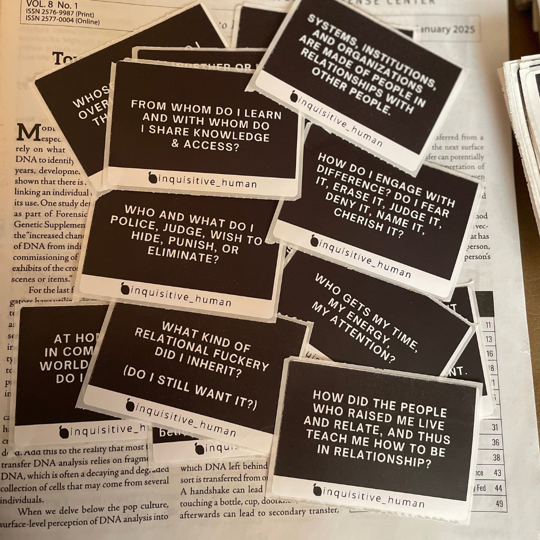 The questions within this sticker pack are simple & powerful tools to get personal & curious with ourselves about the pieces that make up our politics, or our relational lives.