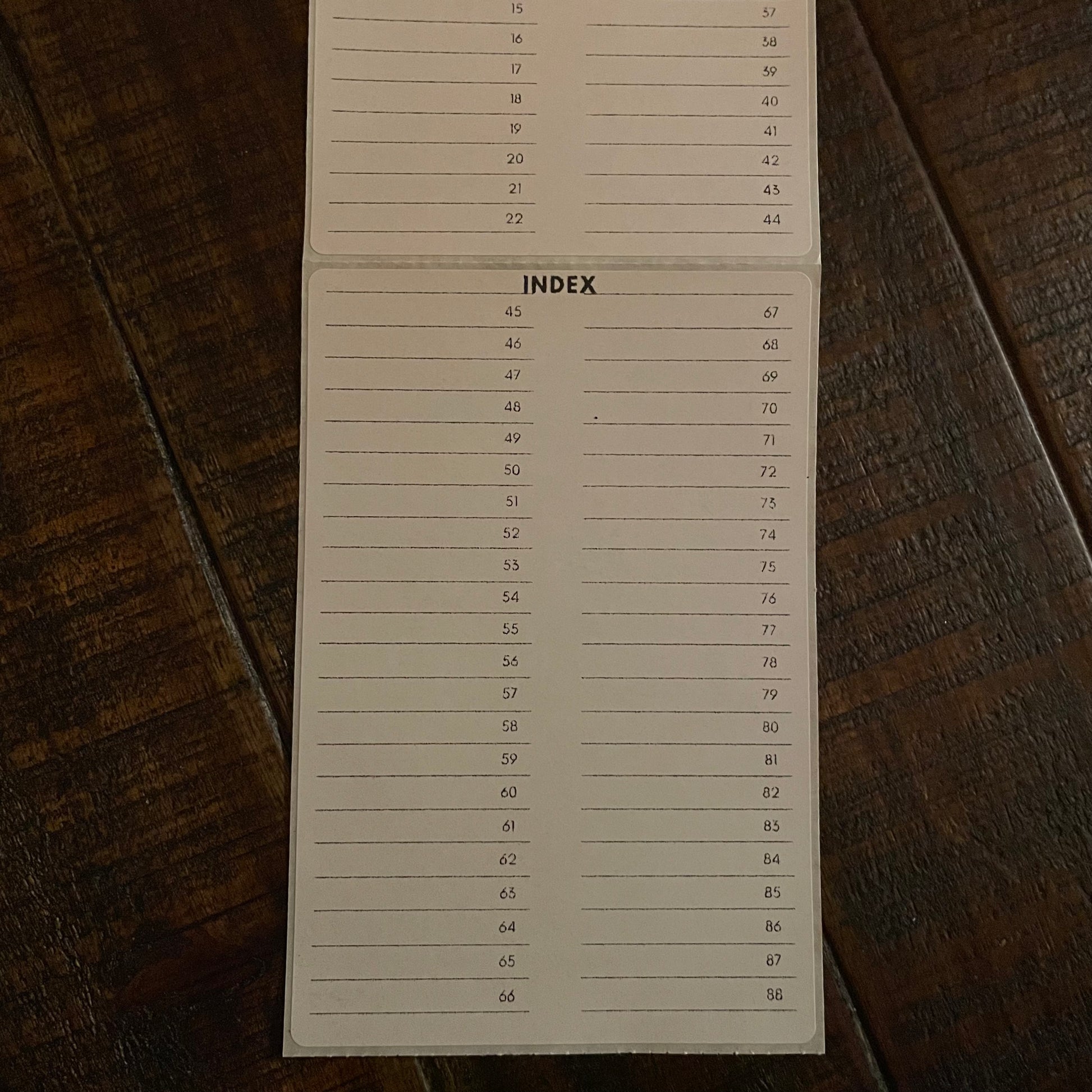 This sticker set (2 stickers) invites you to complete an index for a book, notebook or other source material with 1-88 pages.