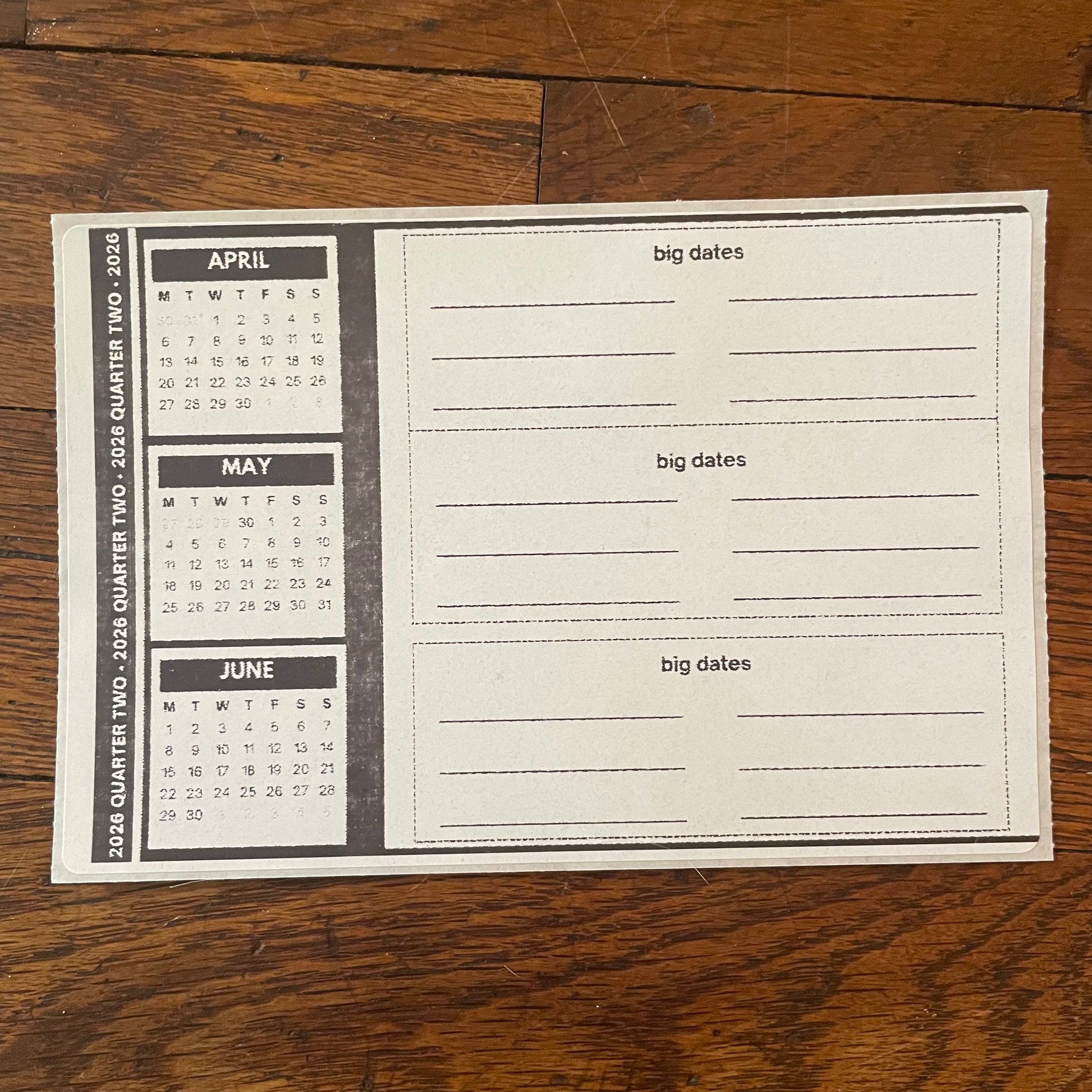 Do you ever struggle to wrap your head around a whole quarter of the year, without the big dates right there to orient? We designed a sticker just for this purpose – a sticker for each quarter of 2026 with little calendars of each month and space to capture big dates and happenings.