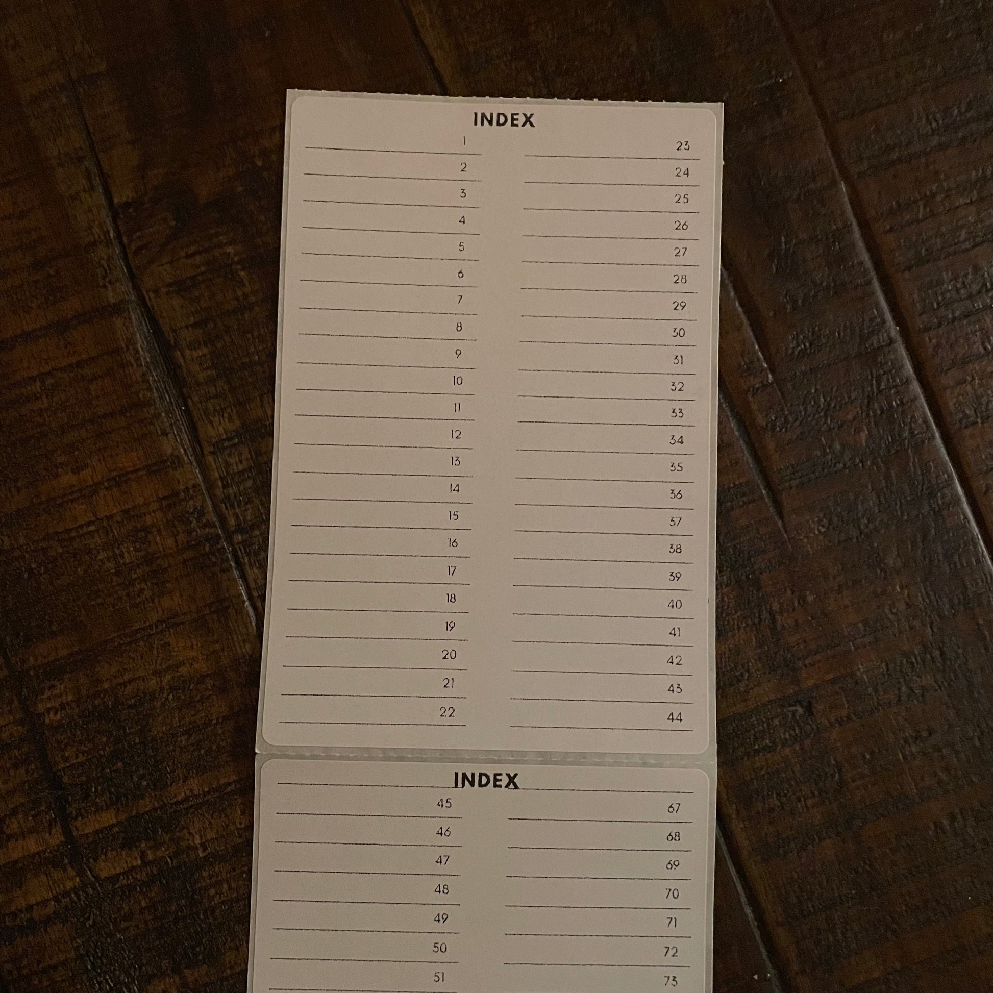 This set of stickers is available in quantities of 1, 3, 15, & 15 – grab just a few or enough to index everything.